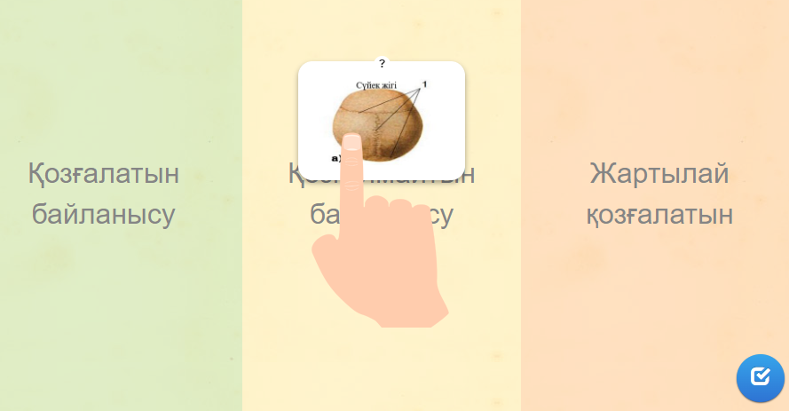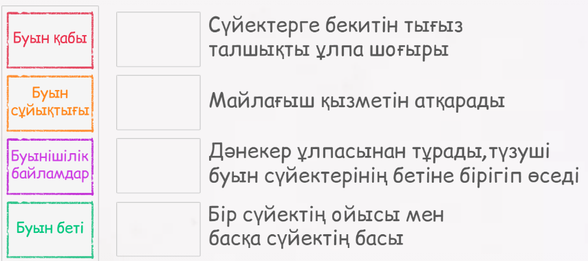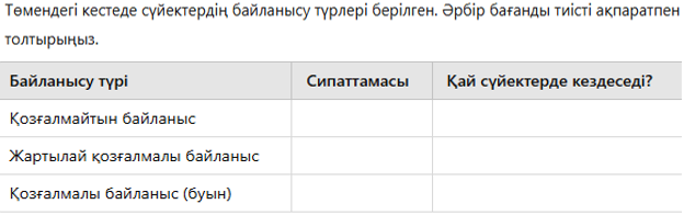 Оқушылар қалыптасты-рушы бағалау тапсырма-ларын орындайды. Тақырыпты оқи отырып берілген тапсырманы орындайды. Сүйектердің байланысу түрлерін салыстырады. Оқушылар буынның негізгі элементтері мен олардың сипаттамалары берілген дұрыс сәйкестікті табады. Оқушылар сүйек байланыстарын күнделікті өмірмен байланыстыру арқылы функционалдық сауаттылығын арттырады.