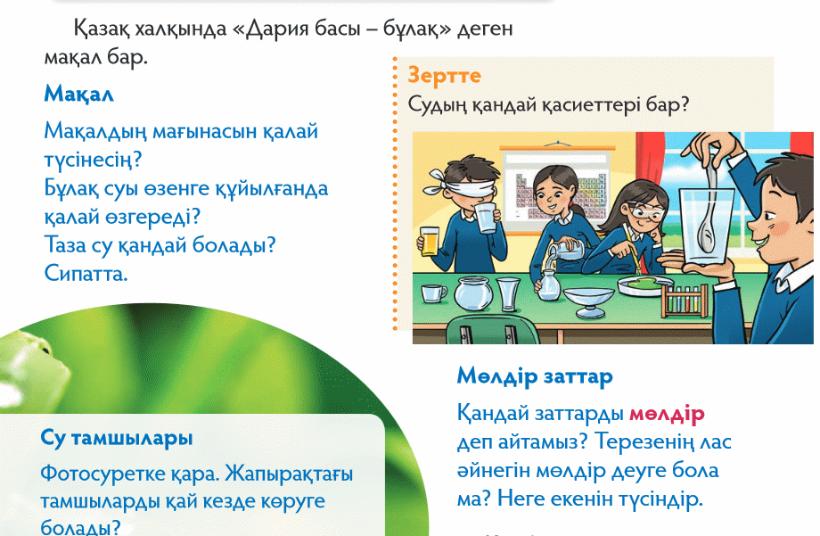2.2.4.5 Судың адам өміріндегі маңызды, оны қорғау туралы оқушылардың білімдерін қалыптастыру және олардың қызметтерін атау; |