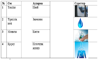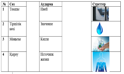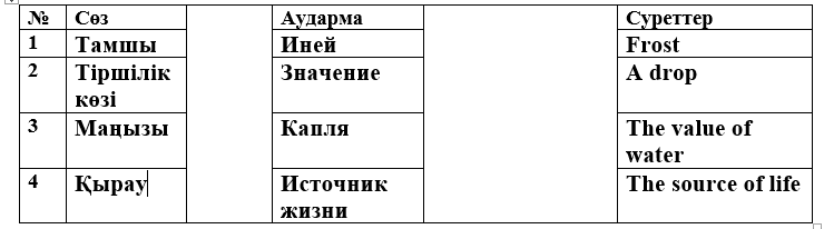 ҚБ «Үш шапалақ» әдісі Дескриптор: Берілген сөздерді аудармасымен сәйкестендіреді А деңгейі Тамшы – капля Қырау – Иней Тіршілік көзі – Источник жизни Маңызы – Значение Дескриптор: Жаңа сөздер мен олардың аудармасын және жаңа сөздерге қатысты суреттермен сәкестендіреді В деңгейі Тамшы – капля – 2 сурет Қырау – Иней – 3 сурет Тіршілік көзі – Источник жизни – 1 сурет Маңызы – Значение – 4 сурет Дескриптор: Жаңа сөздерді екі тілдегі аудармамен сәйкестендіреді. С деңгейі Тамшы – капля – a drop Қырау – Иней – frost Тіршілік көзі – Источник жизни – the source of life Маңызы – Значение –the value of water |