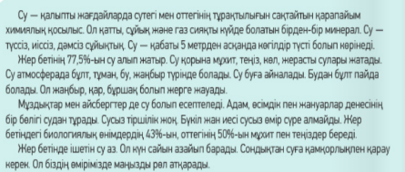 1 Wordwall платформасы арқылы оқушылар кезекпен тақтаға шығып, берілген ақпараттарды мәтін бойынша дұрыс/бұрыстығын анықтай отырып, сөйлемдерді «Дұрыс» «Қате» деген бұлттарға орналастырады. Функцианалдық сауаттылыққа құрылған тапсырма. «Қима қағаздар арқылы» топқа бөлінеді. Оқушыларға қима қағаздадарын беремін. Қима қағаздарында БҰЛТ, КВАДРАТ, ТАМШЫ, яғни судың үш күйі бойынша 3 баладан топқа бөлінеді. 2 тапсырма. Әр топ берілген мәтін бойынша сұрақтарға «Solo» әдісі бойынша жауап береді.