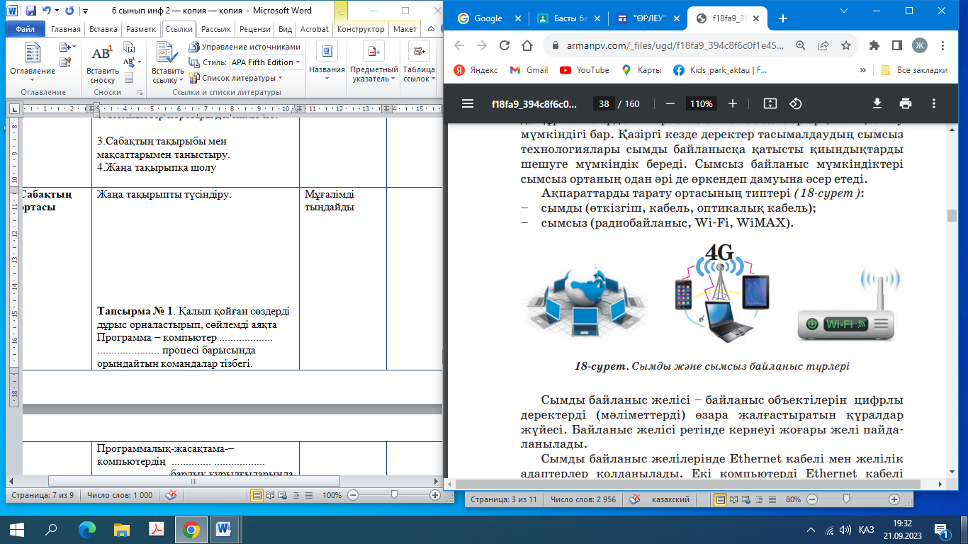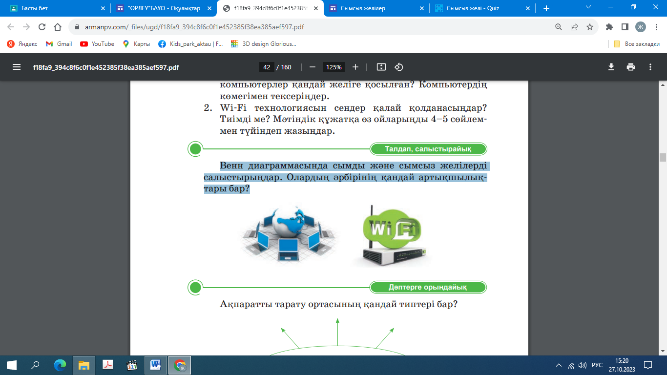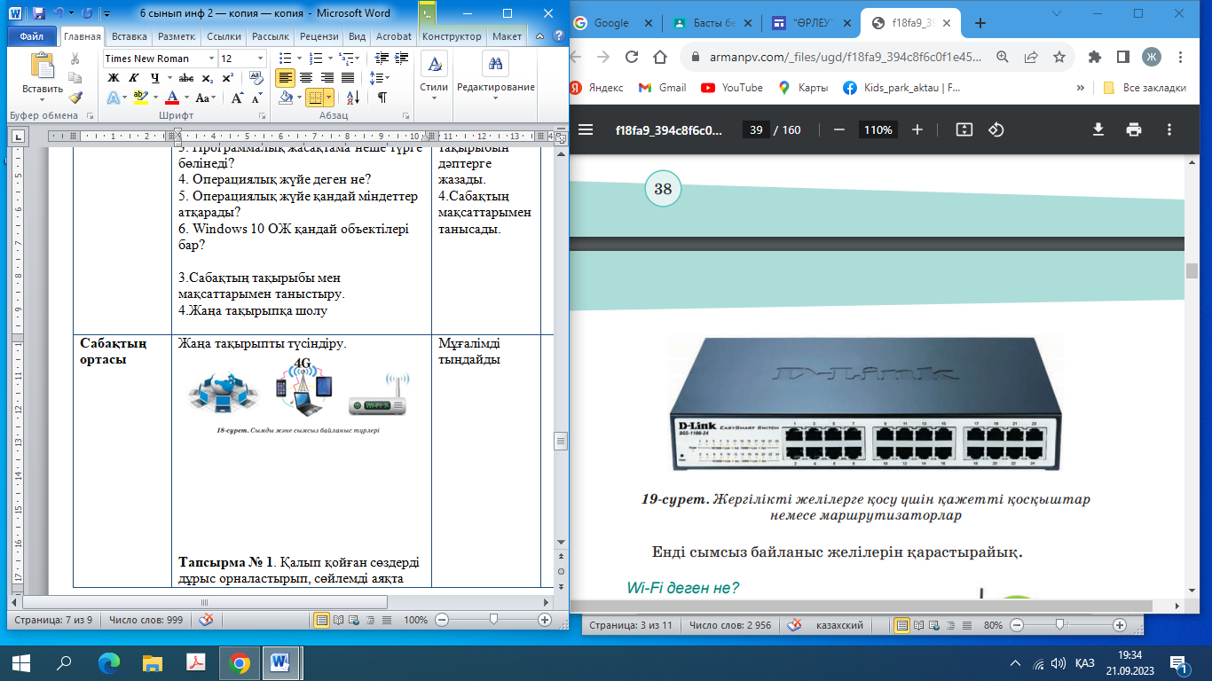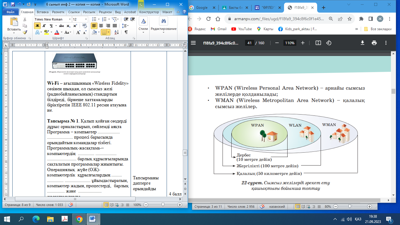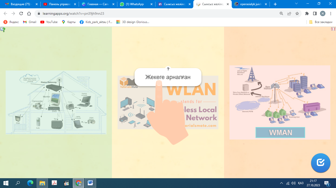 Сабақтың тақырыбын дәптерге жазады. Ютубқа жүктелген жаңа https://youtu.be/-gG7bywaHvA?si=kbMKK8gYaQ3y9lwpp сабақпен танысады https://wordwall.net/ru/resource/62342915 платформасында берілген тест сұрақтарына жауап береді https://learningapps.org/watch?v=pn39jh9nn23 платформасында WLAN,WPAN,WMAN сымсыз желілерінің қызметін өз тобына сәкестіндіреді