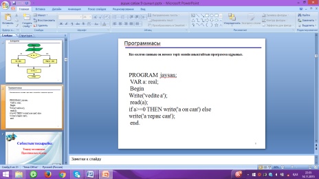 Оқушылар В деңгейіндегі есептің программасын компьютерде орындайды. С деңгейіндегі тапсырманы 1-топ тармақталу if операторы бойынша құрса, 2-топ таңдау case операторы бойынша құрады. Program esep1; Var a:integer; Begin Write (‘Керекті орынды енгізіңдер’); Readln (а); Case а of 1: writeln (‘алтын медаль’); 2: writeln (‘күміс медаль’); 3: writeln (‘қола медаль’); 4: writeln (‘жұбаныш жүлдесі’); Else writeln (‘қайталау’); End. Program esep2; Var x:integer; Begin Writeln (‘adam jasyn engiziniz’); Readln (x); Case x of 1..5 : writeln (‘ali mektepke barmagan’); 6..17: writeln (‘mektep okushysy’); 18..58: writeln (‘jumisshi’); 59..100: writeln (‘zeinetker’); Else writeln (‘kaitys bolgan’); End; End. Program esep2; Var x:integer; Begin Writeln (‘adam jasyn engiziniz’); Readln (x); If x<=6 then writeln (‘ali mektepke barmagan’) else If (x>6) and (x<=17) then writeln (‘mektep okushysy’) else If (x>17) and (x<58) then writeln (‘jumisshi’) else writeln (‘zeinetker’); End. |