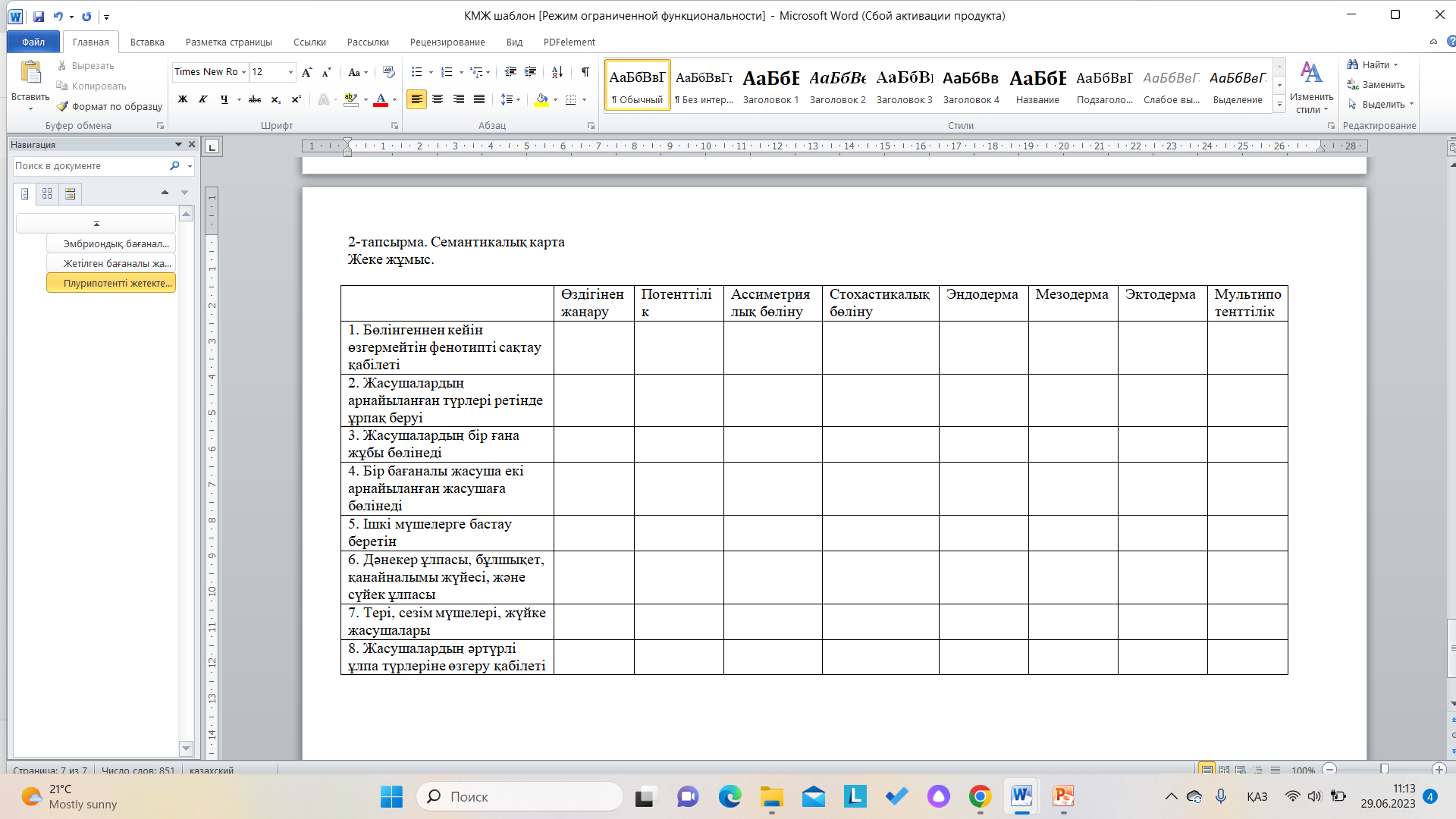 «Саусақ әдісі» бойынша бағалау Дескриптор: -Мәтіннің негізгі түйінін анықтайды; -Бағаналы жасушалардың түрлерін анықтайды; -Бағаналы жасушалардың мамандану үдерісін сипаттайды; -Мәтіндегі негізгі тұжырымдарға сұрақ құрастырады; -«Жауын» әдісі бойынша бағалау. Дескриптор: -Бөлінгеннен кейін өзгер-мейтін фенотиптің сақтау қабілеті анықтайды; -Жасушалардың арнайы-ланған түрлері ретінде ұр-пақ беру түрін анықтайды; - Жасушалардың бір ғана жұбының бөлі түрін көр-сетеді; - Бір бағаналы жасу-ша екі арнайыланған жасу-шаға бөлу түрін анықтай-ды; -Ішкі мүшелерге бастау беретін қабатты анықтай-ды; - Дәнекер ұлпасы, бұл-шықет, қанайналымы жүйесі және сүйек ұлпасы түзілетін қабатты анықтай-ды; - Тері, сезім мүшелері, жүйке жасушалары түзіле-тін қабатты анықтайды; -Жасушалардың әртүрлі ұлпа түрлеріне өзгеру қабі-летін көрсетеді. ЕБҚО дескриптор: -Бөлінгеннен кейін өзгер-мейтін фенотиптің сақтау қабілеті анықтайды; - Жасушалардың бір ғана жұбының бөлі түрін көрсетеді;-Ішкі мүшелерге бастау беретін қабатты анықтайды; - Тері, сезім мүшелері, жүйке жасу-шалары түзілетін қабатты анықтайды;- Жасушалар-дың әртүрлі ұлпа түрлеріне өзгеру қабілетін көрсетеді. «Жапондық бағалау» әдісі. Дескриптор: Сәйкестікті табу: -Жасушаларды аллогенді қалпына келтіру әдісін анықтайды; - Жасушаларды аутогенді қалпына келтіру әдісін анықтайды; - Бағаналы жасушалардың анықтамасын табады; - Жасушаларды гемо-поетикалық қалпына кел-тіру әдісін анықтайды; -Сингенді жасушалардың анықтамасын табады. ЕБҚО дескриптор: - Жасушаларды аутогенді қалпына келтіру әдісін анықтайды; - Бағаналы жасушалардың анықтамасын табады; - Сингенді жасушалардың анықтамасын табады. «ПДМҚ» дескрипторы: - Берілген мәтін бойынша сүйек кемі-гін трансплантация-лауға қатысты пікір білдіреді; -Дәлел келтіреді; -Мысал келтіреді; - Сүйек кемігін транс-плантация үшін қолда-ну материалын сара-лай отырып қоры-тында жазады. |