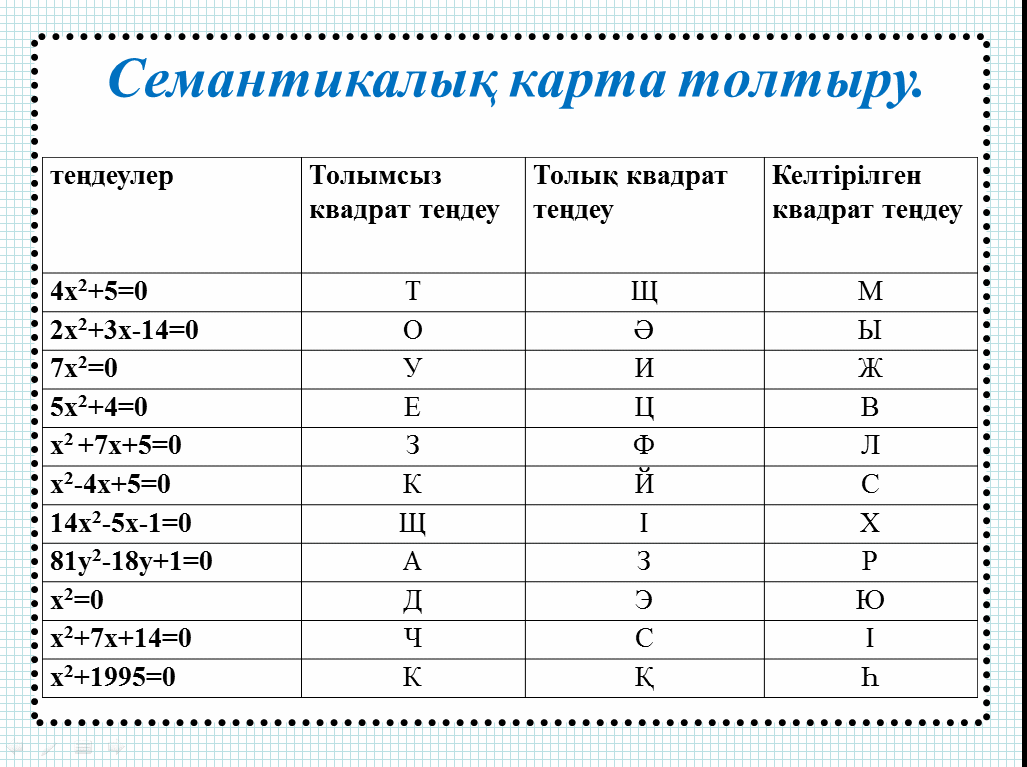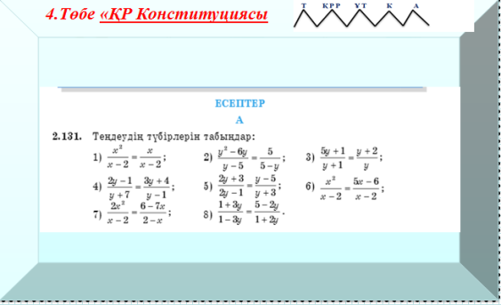 Берілген теңдеулер сізге таныс па? Барлығын шешуді білесіз бе? Білмесеңіз не себепті? сұрақтары қойылады. 2.Төбе «Қ. Р. рәміздері».