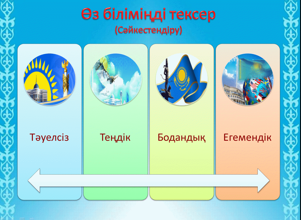 Сөздері қандай мағынаны білдіретініне топ болып ақылдасып, бір топ мүшесі жауап береді. Оқушылар тақтадағы сөздерге сұрақ тауып қояды және де сөз құрастырады. О Т А Н сөзін құрастырады. Балалар сұрақтарға жауап береді. Оқушылар сағат тілінің бағытымен өз есептерінің жауабымен салыстырып, қатесін дұрыстап дәлелдеп береді. Балалар семантикалық картаны толтыру арқылы ТӘУЕЛСІЗДІККЕ 33 ЖЫЛ сөзін шығарады. Оқушылар теңдеулерге назар аударады, сұрақтарға жауап береді. Оқушылар квадрат теңдеуді шешеді. Оқушылар тапсырманы орындау барысында ҚР Ұлттық теңге күнін еске түсіреді. Балалар теңдеудің бүтін рационал немесе бөлшек рационал екенін анықтау арқылы -Ұлттық теңгеміз 1993 жылы 15 қарашада теңге айналымға шыққанын және де бұл күн – ұлттық валюта – теңге күні саналатынын еске түсіреді. Бұл есепті оқушылар «DEAL» әдісі арқылы команда болып қоғап шығу барысында Қазақстанның астаналарын еске түсіре кетеді. Оқушылар теңдеуді шешеді.