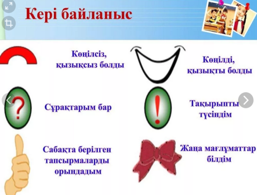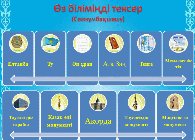 ТӘУЕЛСІЗДІГІМІЗДІҢ НЫШАНДАРЫНА нелер жататынын еске түсіреді. Оқушылар топ болып математикалық диктантқа жауап береді. Оқушылар күнделіктеріне үйге берілген тапсырманы белгілеп алады. «Көңіл-күй» шкаласынан өз көңіл-күйіңе сәйкес суретті таңдап алады. |