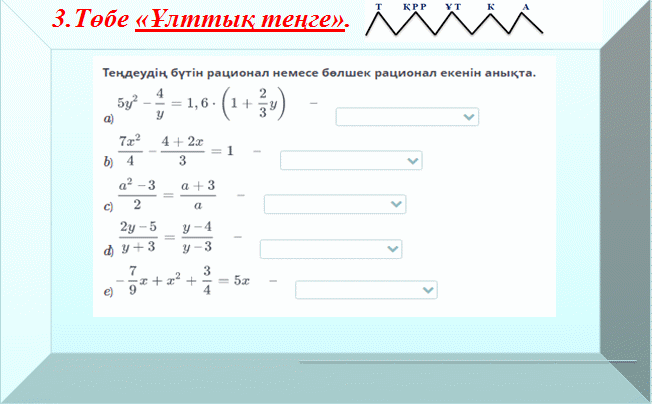 Оқулықтан алынған әр топта бір – бір мысал есептерді команда болып зерттеп, мына әдіс бойынша қорғап шығады. 5.Төбе «Тәуелсіздік нышандары». Лумио платформасы арқылы тақырыптық математикалық диктант. Оқулықтан № 2.139 1. Бөлшек-рационал теңдеу дегеніміз … ? 2. ММЖ деген не? 3. Бөлшек-рационал теңдеуді шешу алгоритмі қандай? 4.Бөгде түбірлер дегеніміз не? 5.Бүтін рационал теңдеулер дегеніміз не? 6. Бөлшек рационал теңдеуінің түбірлерінің саны өзгере ме? Қорытынды баға