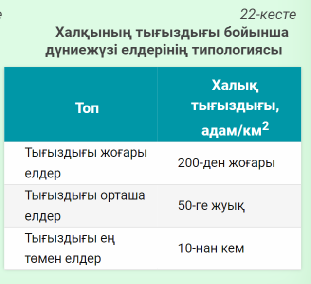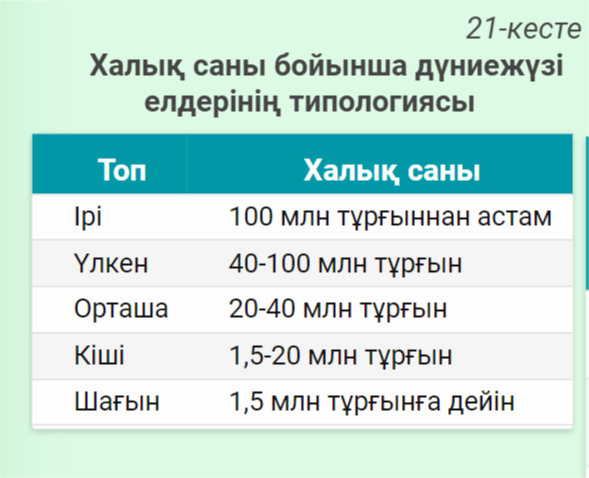 2-ші оқушы 21-кестедегі мәліметтер бойынша еліміздің типологиядағы орнын айқында.