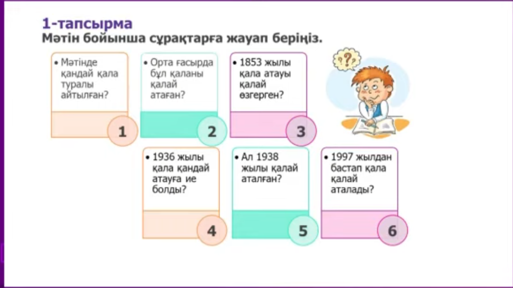 7.1.2.1 тыңдалған мәтіннің негізгі мазмұнын түсіну, ақпараттың өзектілігін анықтау. 7.1.6.1 тыңдалым материалдарының мазмұны негізінде өз пікірін өзгелердің пікірімен салыстыра отырып жауап беру |