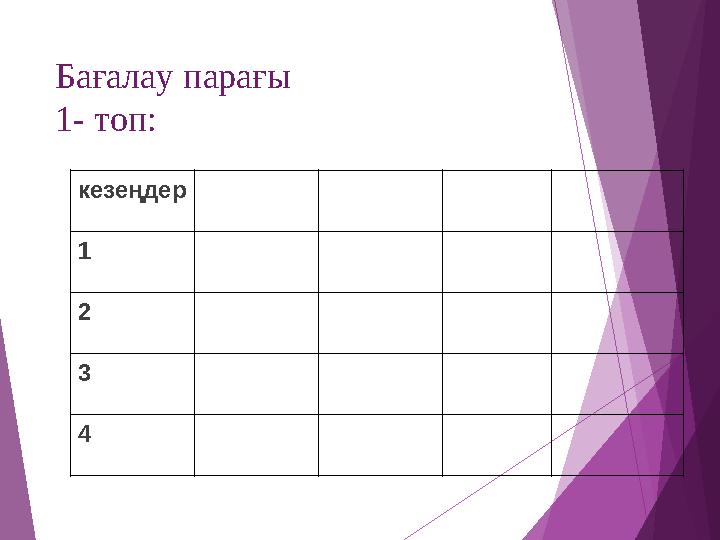 Бойтұмарлар арқылы топқа бөлу ә). Топта жұмыс жасау ережені еске түсіру. б). Топтастыру. в)бағалау парағын тарату |