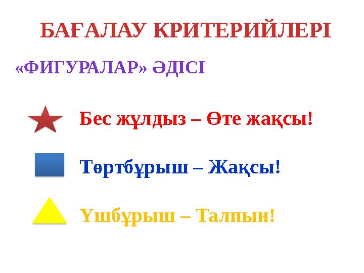 Қалыптастырушы бағалау: Өз ойын дұрыс мағынада білдіріп, белсенділікпен қатысқан оқушыға «Жарайсың!» деген мадақтау сөзімен ынталандыру.