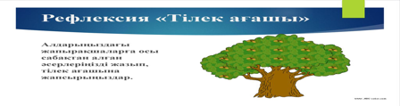 Оқушылар «тілек ағашы» әдісін пайдаланып өз-өздерін бағалайды. Сабаққа баға береді. |