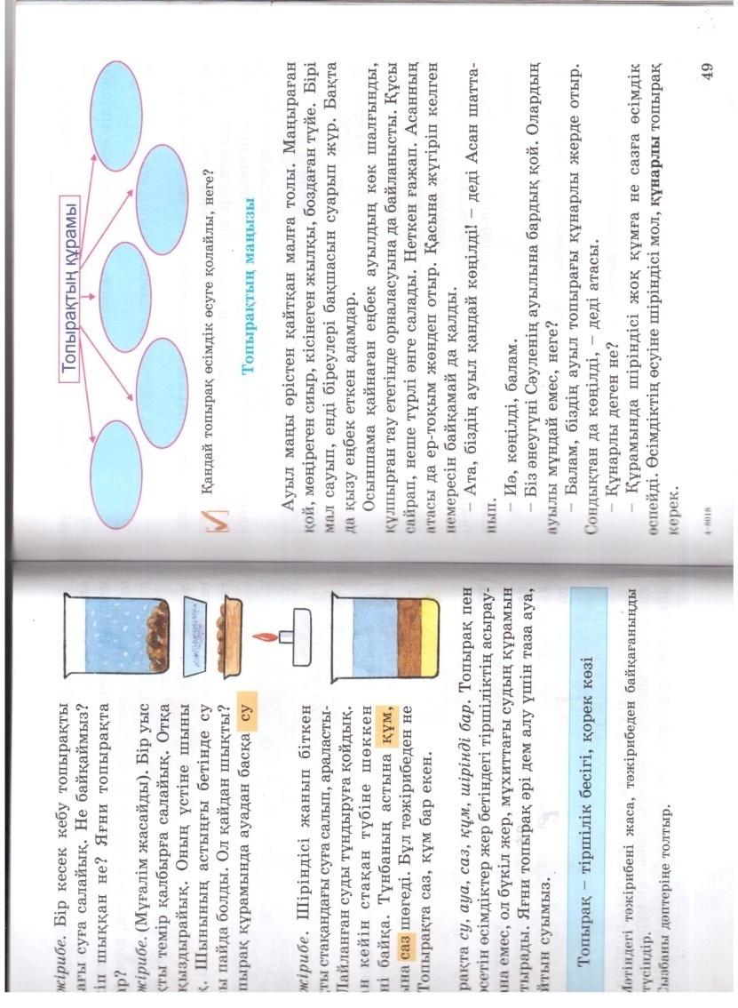 3.3.4.1 Кейбір ағзалардың тіршілігі үшін топырақтың рөлі 3.3.4.2 Топырақтың негізгі құрамын зерттеу (топырақ, құм, балшық, өсімдіктер мен жануарлардың қалдықтары, су, ауа) |