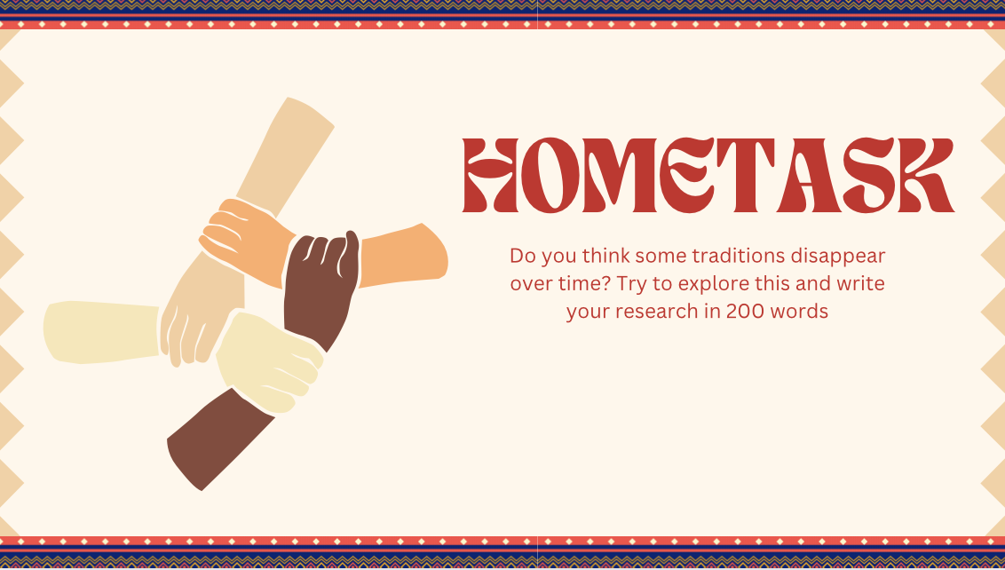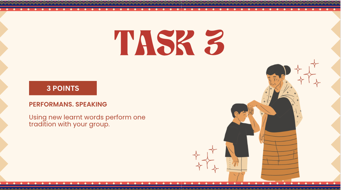 Task 3 Performance The teacher has to prepare four difference traditions around the world |