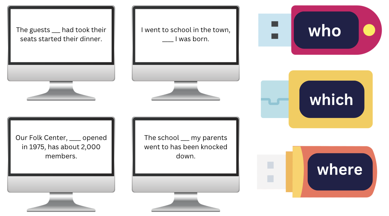 Students have to carefully remember grammar and fill the sentences with correct clause |