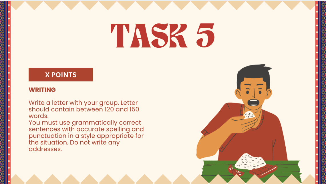 Task 5 The teacher has to prepare 3 different traditions and personas |