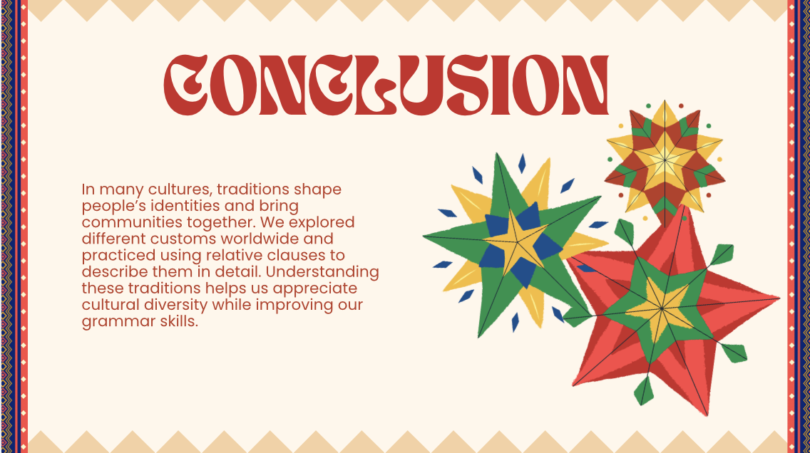 Students have to choose one tradition and perform it using newly learnt words and expressions |