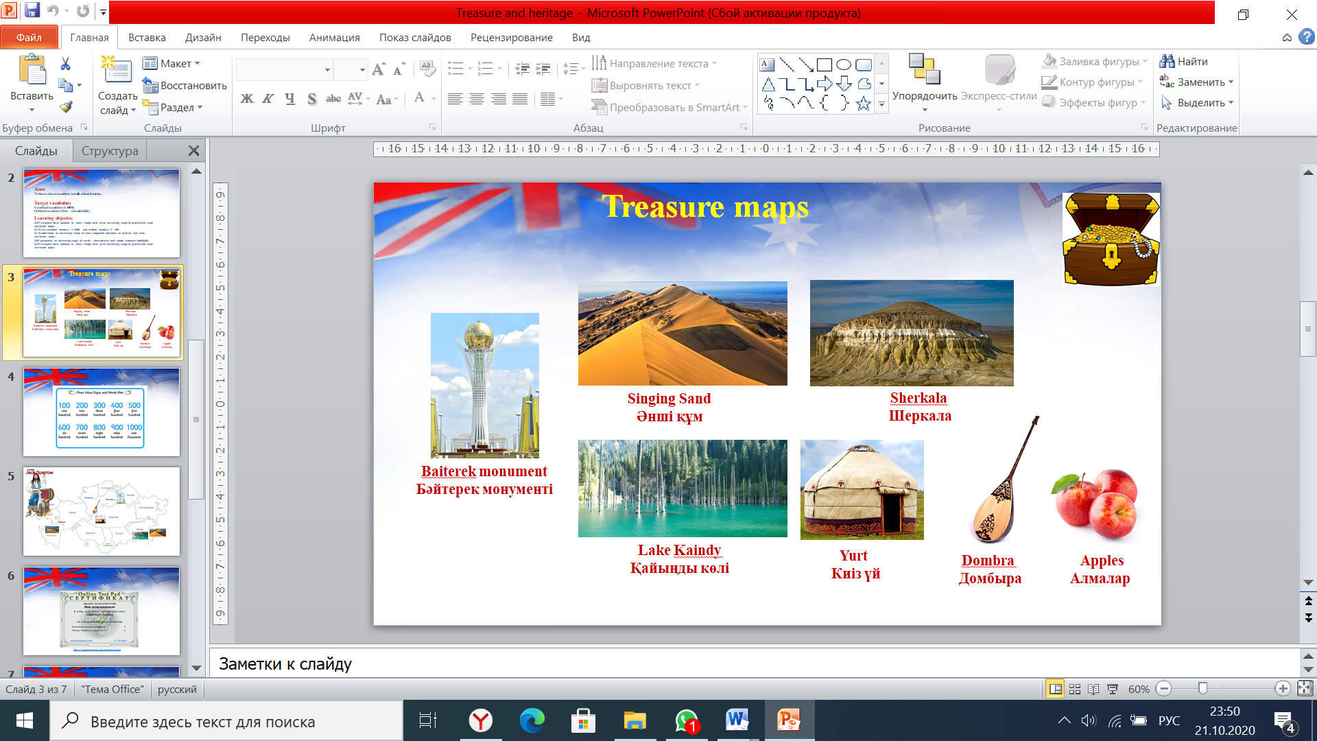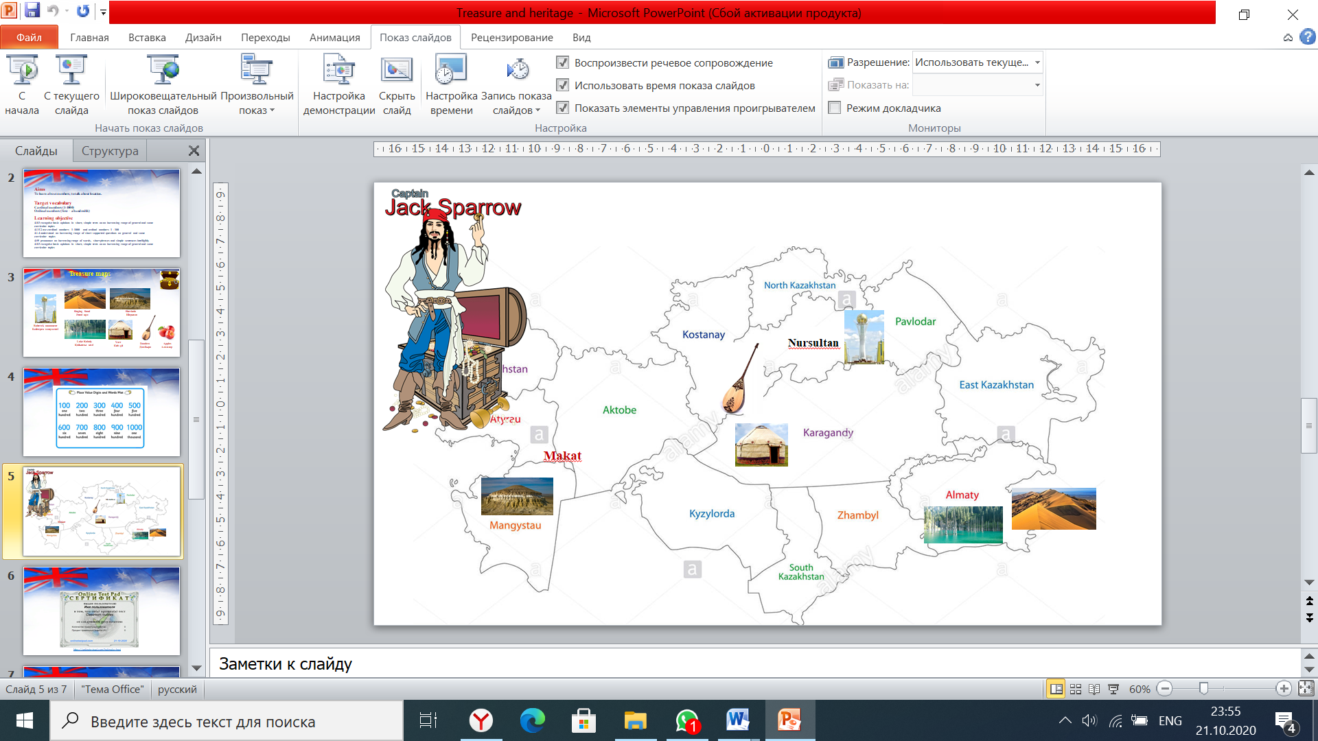 3. New theme. To start our lesson I show them map of Kazakhstan with its heritage. And their favorite character captain Jack Sparrow will be our guest. Learners do the tasks with Jack Sparrow. They must do the tasks to get to the capital city Nur Sultan. To reach the first