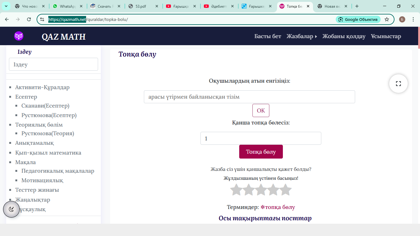 Ұйымдастыру кезеңі: - Амандасу; - Оқушыларды түгендеу Психологиялық ахуал қалыптастыру. «Менен бір мотивациялық сөз» атты психологиялық ахуал туғызу Оқушыларды топтарға біріктіру оқушының аты-жөнін енгізіп, автоматты түрде топқа біріктіріп береді береді https://qazmath.net/ арқылы топқа бірігуге нұсқау береді. 1 топ. 2 топ: 3 топ:
