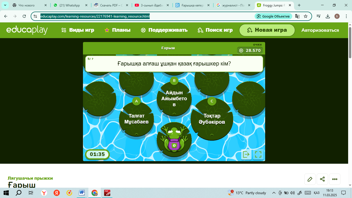 Жұптық жұмыс. 6- тапсырма. 1. Ғарыш ғылымына қанша жасыңыздан бастап қызықтыңыз? 2. Ғарышкер болу үшін қанша еңбектендіңіз? Сұрақтарына жауап жазыңыз Сергіту сәті «Биле, биле»биі 3 кезең Робот кезеңді түсіндіреді «Жаңашылдық» әдісімен «Еducaplay» платформасы арқылы оқушыларға сұрақтар қойылады. «wordwall» платформасы арқылы оқушыларға сұрақтар қойылады |