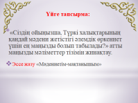 Үйге тапсырма: «Сіздің ойыңызша, Түркі халықтарының қандай мәдени жетістігі әлемдік өркениет үшін ең маңызды болып табылады?» атты маңызды мәліметтер тізімін жинақтау.Эссе жазу «Мәдениетім мақтанышым»