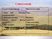 Берілген ғұламаларды шыққан жерлеріне апарып орналастыру. Әбу Насыр Мұхаммед ибн Тархан ибн Ұзлағ әл-Фараби Ж.Баласағұн М. Қашғари Ахмет Яссауи Ахмет Иүгнеки |
