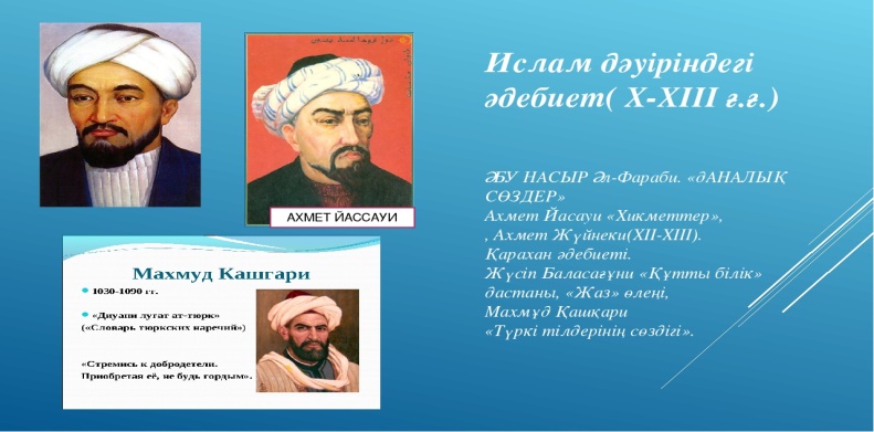 6.2.3.2 Әл-Фарабидің және басқа да ғалымдардың ортағасырлық ғылымның дамуына қосқан үлесін анықтау 6.2.2.4 түркі кезеңіндегі қоғамды бейнелеуде М. Қашғари, Ж. Баласағұн және А. Яссауи еңбектерінің тарихи құндылығын түсіндіру; |