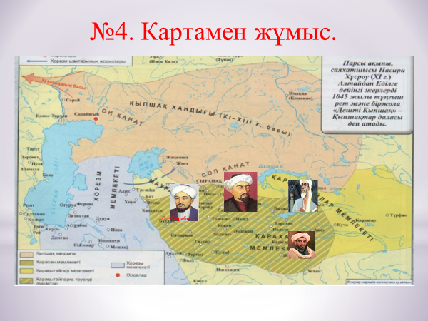 Дескриптор: Әбу Насыр әл-Фараби, Ж.Баласағұн, М. Қашғари, Ахмет Яссауи, Ахмет Иүгнекиді шыққан жерлері бойынша дұрыс картаға іліп, орналастыру. №4 Картамен жұмыс- 2 балл