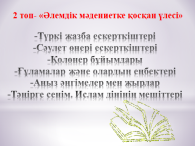 2 топ- «Әлемдік мәдениетке қосқан үлесі» (постер қорғайды)