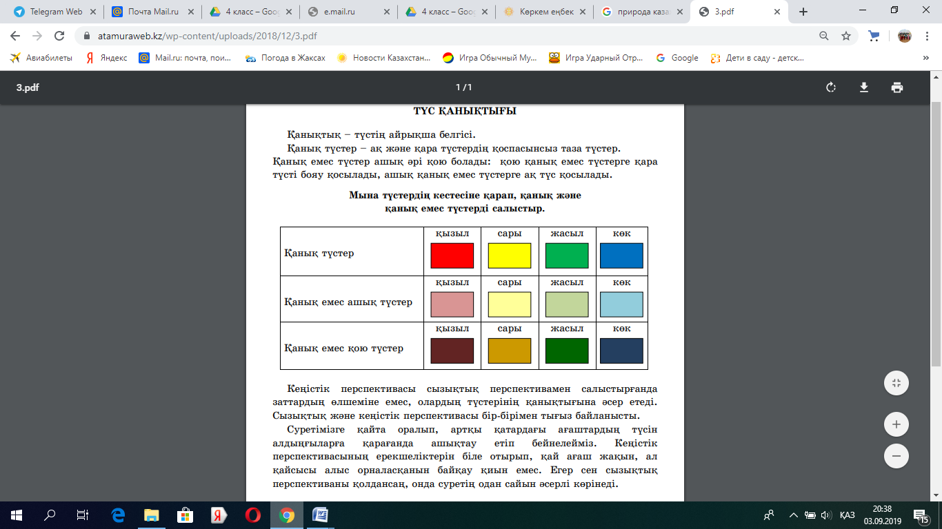 Берілген сұраққа жауап беріп, тапсырмаларды талапқа сай орындайды. Белсенді оқу тапсырмалары. Сәйкестендіреді Түстер үйлесімі туралы түсінеді |