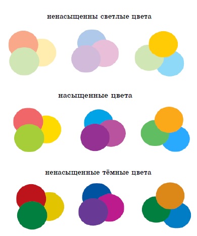 Түс арқылы сезімімізді білдіреміз Қанық емес ашық түстер. Қанық түстер үйлесімі. Қанық емес қою түстер үйлесімі. |