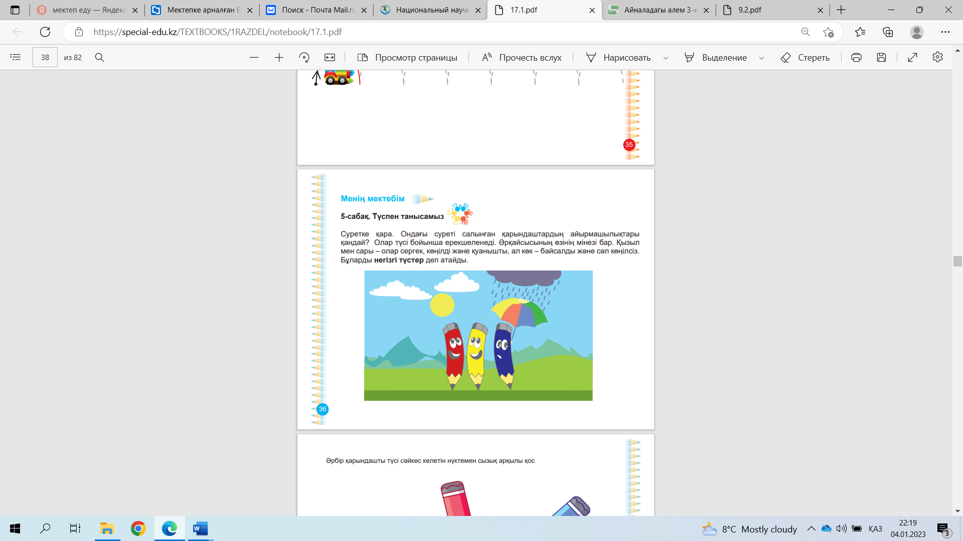 Амандасу: -Сәлеметсіздерме оқушылар! Көңіл-күйлеріңіз қалай? Психологиялық ахуал қалыптастыру. Сәлемдесейік иіліп, Жылы жүзбен жымиып. Қызығы мол сабақта Ойнайық та күлейік Оқушылар, тақтаға (экранға) қарайықшы, мына суреттен не көріп тұрсыңдар? -Иә, жарайсыңдар суретте қарындаштар көрсетілген. Суретке қара. Ондағы суреті салынған қарындаштардың айырмашылықтары қандай? Олар түсі бойынша ерекшеленеді. Әрқайсысының өзінің мінезі бар. Қызыл мен сары – олар сергек, көңілді және қуанышты, ал көк – байсалды және сәл көңілсіз. Бұларды негізгі түстер деп атайды. Басқада түстермен танысу үшін видеоны тамашалайық. (видео https://www.youtube.com/watch?v=3FbxhGZzblI )Бүгін біз осы түстер әлеміне сапар шегіп, қызықты тапсырмаларды орындайтын боламыз. Ендеше, қызықты тапсырмаларды орындауды бастайық. |