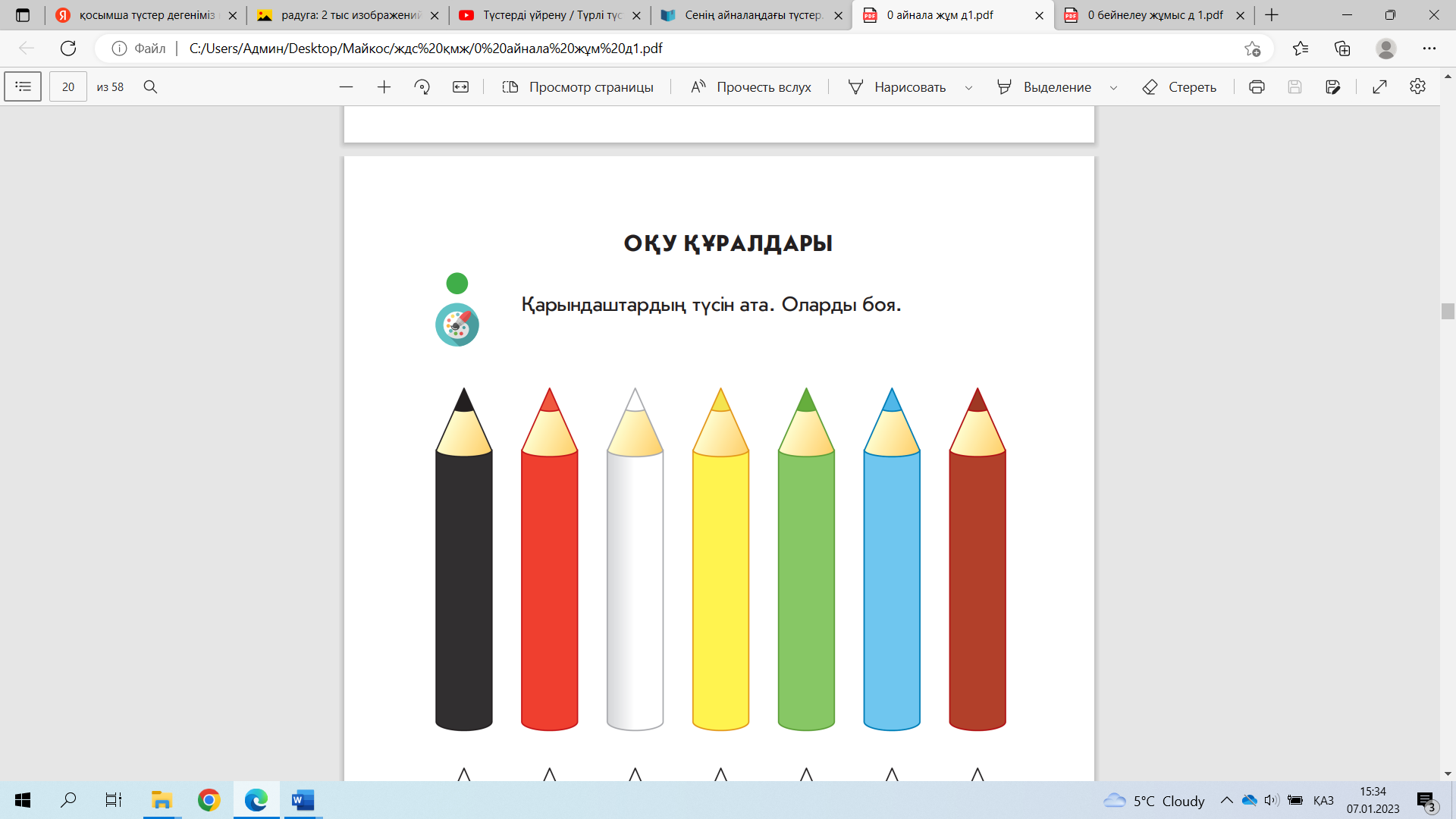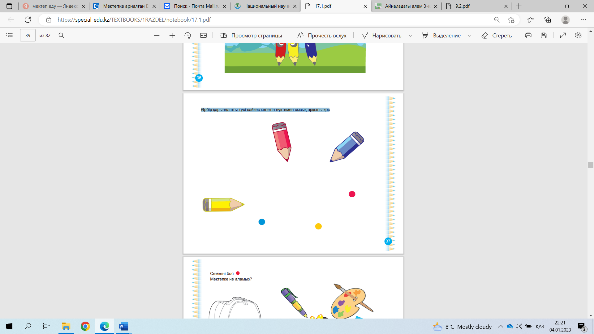 1-тапсырма. «Сәйкестендір» тапсырмасы Мақсаты: Түстерді үйрету, зейінін шоғырландыру, түстерді ажыратуды үйрету; Барысы: Оқушыларға тапсырма көрсетілген парақтар беріледі. Парақтардағы әрбір қарындашты түсі сәйкес келетін нүктемен сызық арқылы қосуы және олардың түстерін атауы қажет.