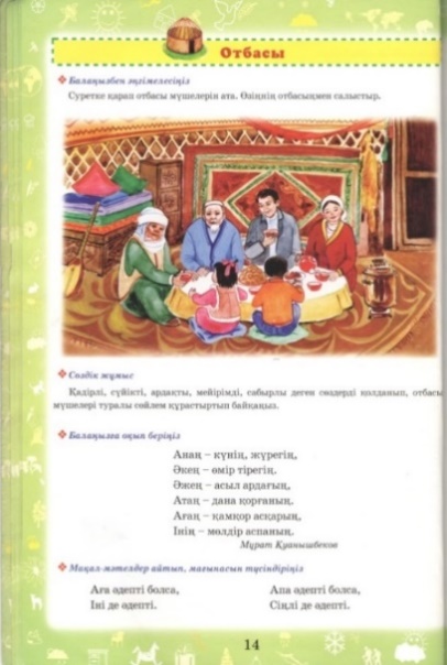 О Ал балалар тұрайық, Үлкен шеңбер құрайық. Шаңырақты көтеріп, Керегені құрайық Уық болып иіліп, Бір отбасы болайық. 4-тапсырма. «Бұл не?» Мақсаты: сурет бойынша заттарды табу, түсін, пішінін жіне қажеттілігін айтуды үйрену. Барысы: Суреттегі заттардың не екендігін тауып, оның түсін, пішінін және оның бізге қажеттілігін айтуы қажет |