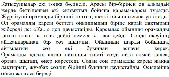 Ұлттық ойындар түрлерін айта алады,сөйлеу барысында суреттерді пайдаланып, таныстырылымын таныстырады. Ойын ережесін құрастыра алады. Ұлттық ойын түрлерін ажырата алады.  |