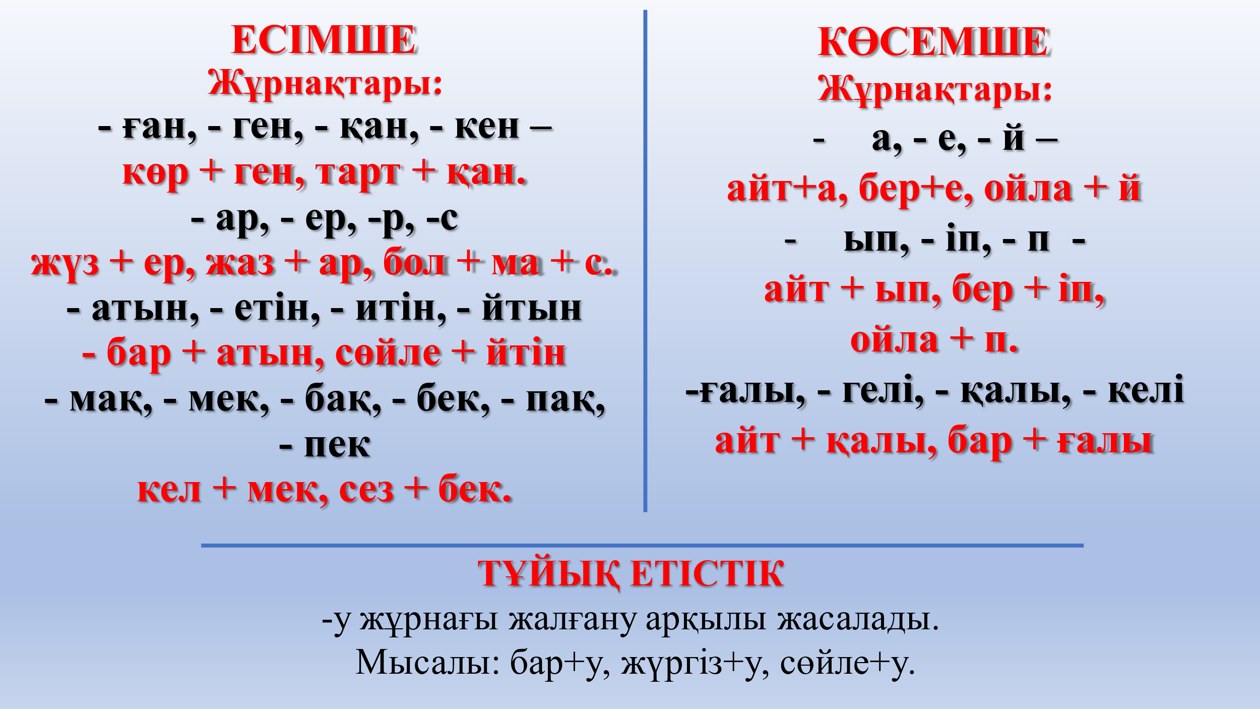 Мұқағали, Төлеген, Мұхтар ақындардың дос туралы жазылған өлең үзінділерінен көсемшелі етістіктерді теріп алып, жасалу жолдарын түсіндіреді. Түбір мен қосымшасын ажыратады.