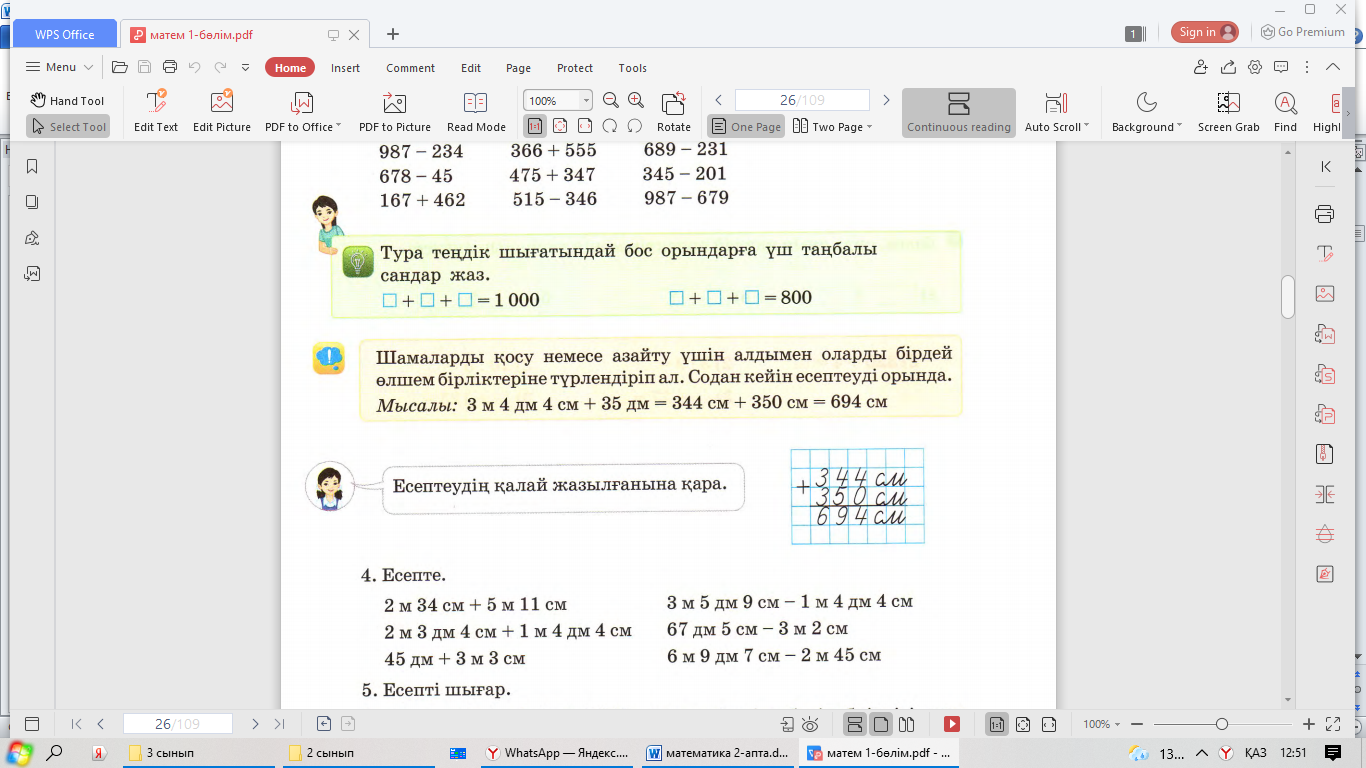 3.1.2.5 үш таңбалы сандарды/мыңдықтарды санның ондық құрамы негізінде ауызша қосу және азайтуды орындау 3.1.2.8 үш таңбалы сандарды жазбаша қосу және азайту алгоритмдерін қолдану |