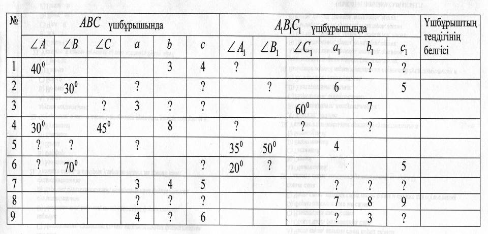 7.1.1.21үшбұрыштар теңдігінің белгілерін білу және дәлелдеу; 7.1.1.22үшбұрыштар теңдігінің белгілерін есептер шығару мен дәлелдеулерде қолдану |