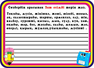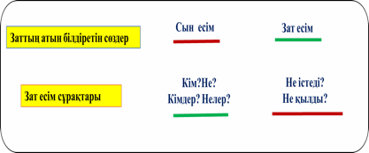 1 топ оқушылары сөздердің ішінен зат есімді тауып жазады. 2 топ оқушылар зат есімдерді сұрағымен сәйкестендіреді. 2 топ оқушылар зат есім туралы білетіндерін жазады.
