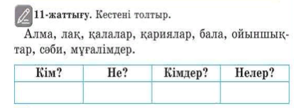1. кім? сұрағына жауап беретін сөздерді жазады 2. не? сұрағына жауап беретін сөздерді жазады 3. кімдер? сұрағына жауап беретін сөздерді жазады 4. нелер? сұрағына жауап беретін сөздерді жазады Жаңбырдың жаууына байлынысты қимыл –қозғалысты жасайды