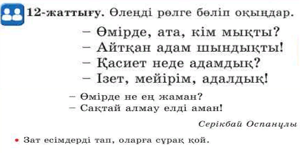 1. өлеңді рөлге бөліп оқиды 2.өлеңдегі зат есімдерге сұрақ қояды
