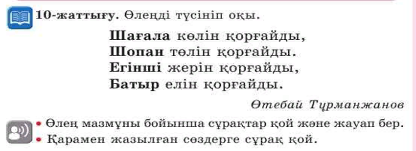 1. өлеңнің мазмұнын әңгімелейді 2.өлең мазмұны бойынша сұрақ құрастырады 3.қарамен жазылған сөздерге сұрақ қояды |