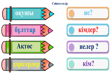 2.4.2.3 Сөз таптарын (зат есім, сын есім, сан есім, етістік) ажырату; 2.2.3.1 - мәтін мазмұнын анықтауға бағытталған сұрақтар құрастыру және жауап беру |
