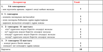 Мадақтау Мадақтау Жарайсың!, Керемет! Жақсы! Талпын! Дескриптор: -өлеңнің мазмұнын әңгімелейді(1б) -өлең мазмұны бойынша сұрақ құрастырады(1б) -қарамен жазылған сөздерге сұрақ қояды(1б) |
