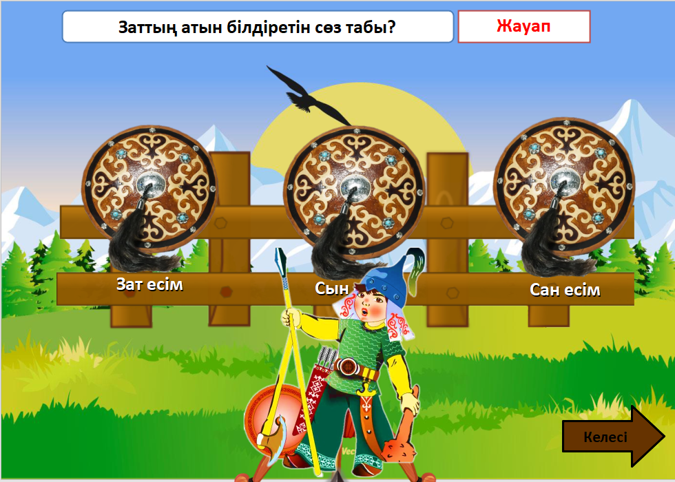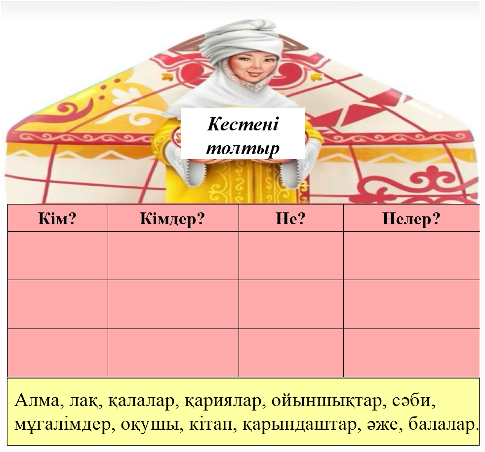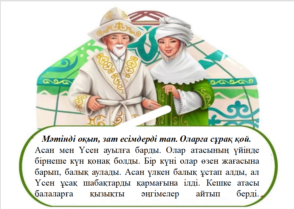 2.2.3.1 мәтін мазмұнын анықтауға бағытталған сұрақтар құрастыру және жауап беру; 2.4.2.3 cөз таптарын зат есім, сын есім, сан есім, етістік ажырату; 2.1.3.1 күнделікті өмірде кездесетін жағдаяттарға байланысты сөйлеу мәдениетін сақтап, диалогке қатысу. |