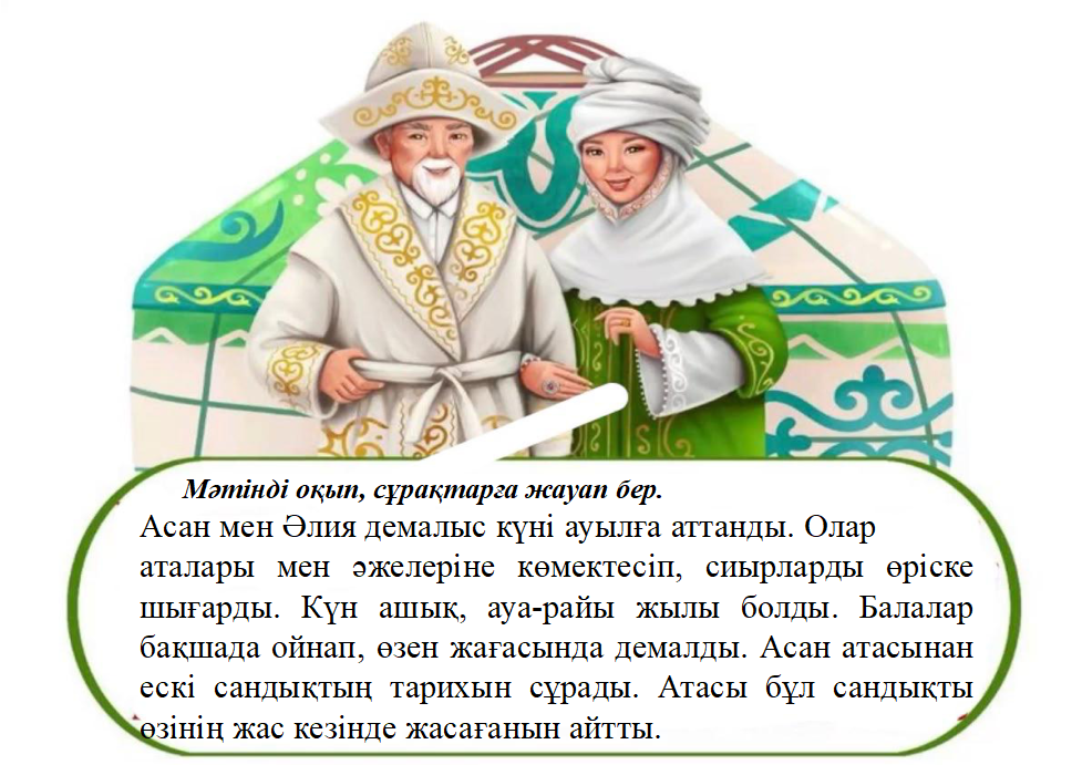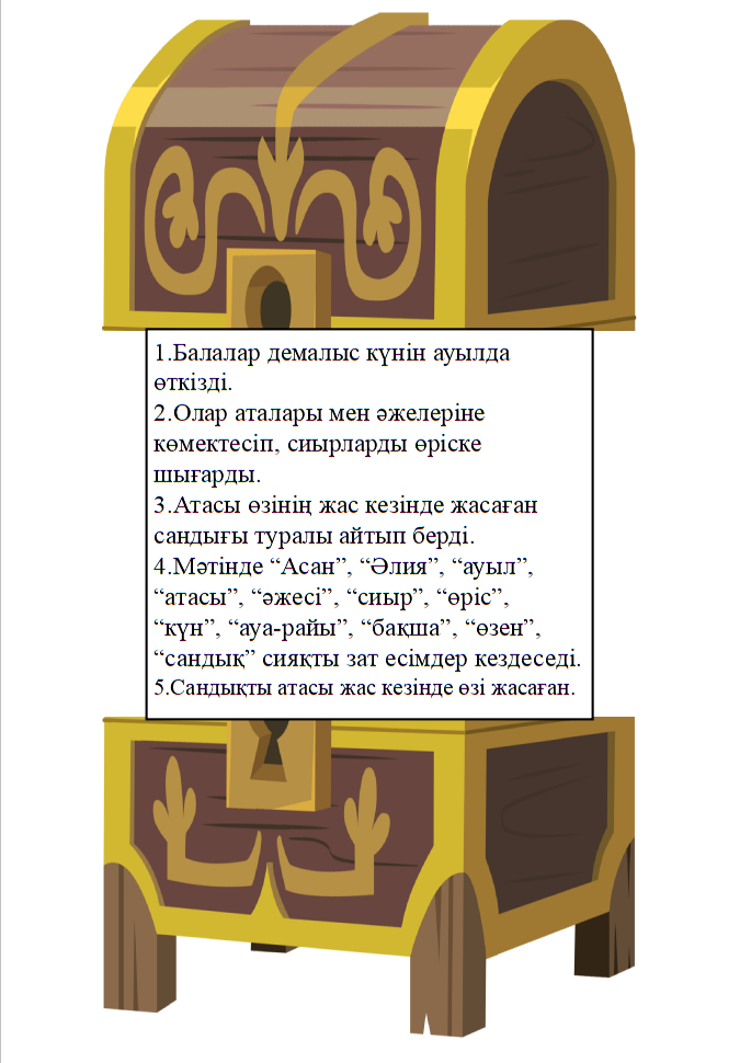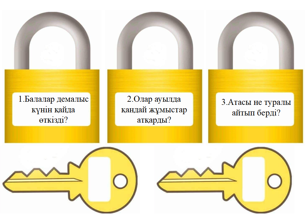 1-тапсырма: Оқылым. Жазылым. Айтылым Топтық жұмыс Функционалдық сауаттылыққа арналған тапсырмалар беріледі. 1-топ. Мәтінді оқыңдар. “Сәйкестендіру” әдісі арқылы мәтін мазмұны бойынша құлыптағы сұрақтар мен кілттегі жауаптарды сәйкестендіріп, сандықты ашыңдар.