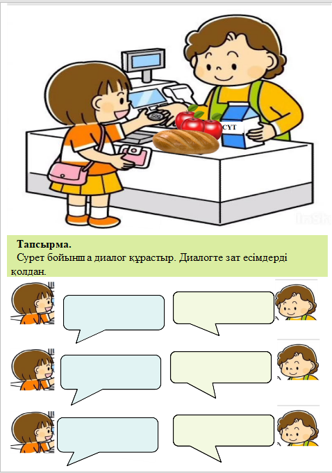 3-топ Берілген сурет бойынша диалог құрастырыңдар. Диалогте зат есімді қолданыңдар.