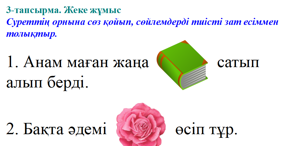 Үй тапсырмасын тексеру. 9-тапсырма. Көп нүктенің орнына керекті сөздерді қойып, өлеңді көшіріп жаз. Зат есімнің астын сыз. Өс-өс, балам, өсе бер, ... бол палуан білекті, ... бол таймас жүректі, ... созайық, ... жазайық. Керекті сөздер: аяғыңды, батыл, батыр, саусағыңды. Жаңа тақырып Жаңа тақырыпты болжау мақсатында суреттер көрсетіледі. Мұғалім жетекші сұрақтар қояды: 1. Суреттен нені көріп тұрсыңдар? 2. Ол сөздер қандай сөз табына жатады? 3. Сонымен бүгінгі сабақтың тақырыбы қандай деп ойлайсыңдар?