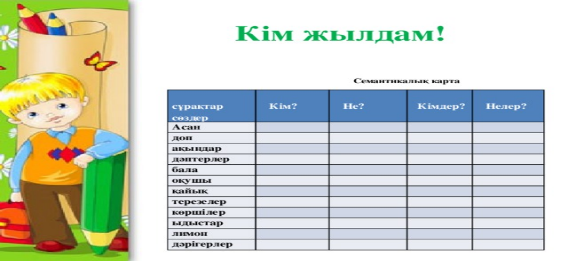 3.2.3.1 мәтін мазмұны бойынша пікір білдіруге бағытталған сұрақтар құрастыру және жауап беру 3.4.2.3 сөйлемнен сөз таптарын (зат есім, сын есім, сан есім, етістік) табу |