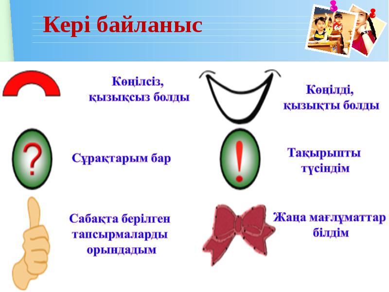 Оқушылар сабақтан алған әсерлерін кері байланыс парағы тапсырмалары арқылы білдіре алады. |